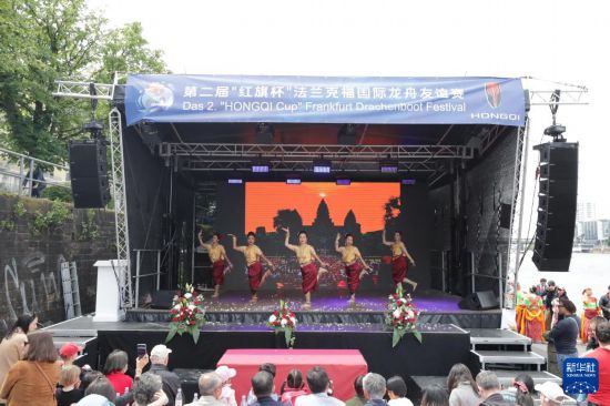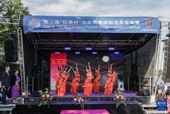 5月24日,湖北省演艺集团演员在第二届德国法兰克福国际龙舟友谊赛期间表演舞蹈。新华社记者 张帆 摄