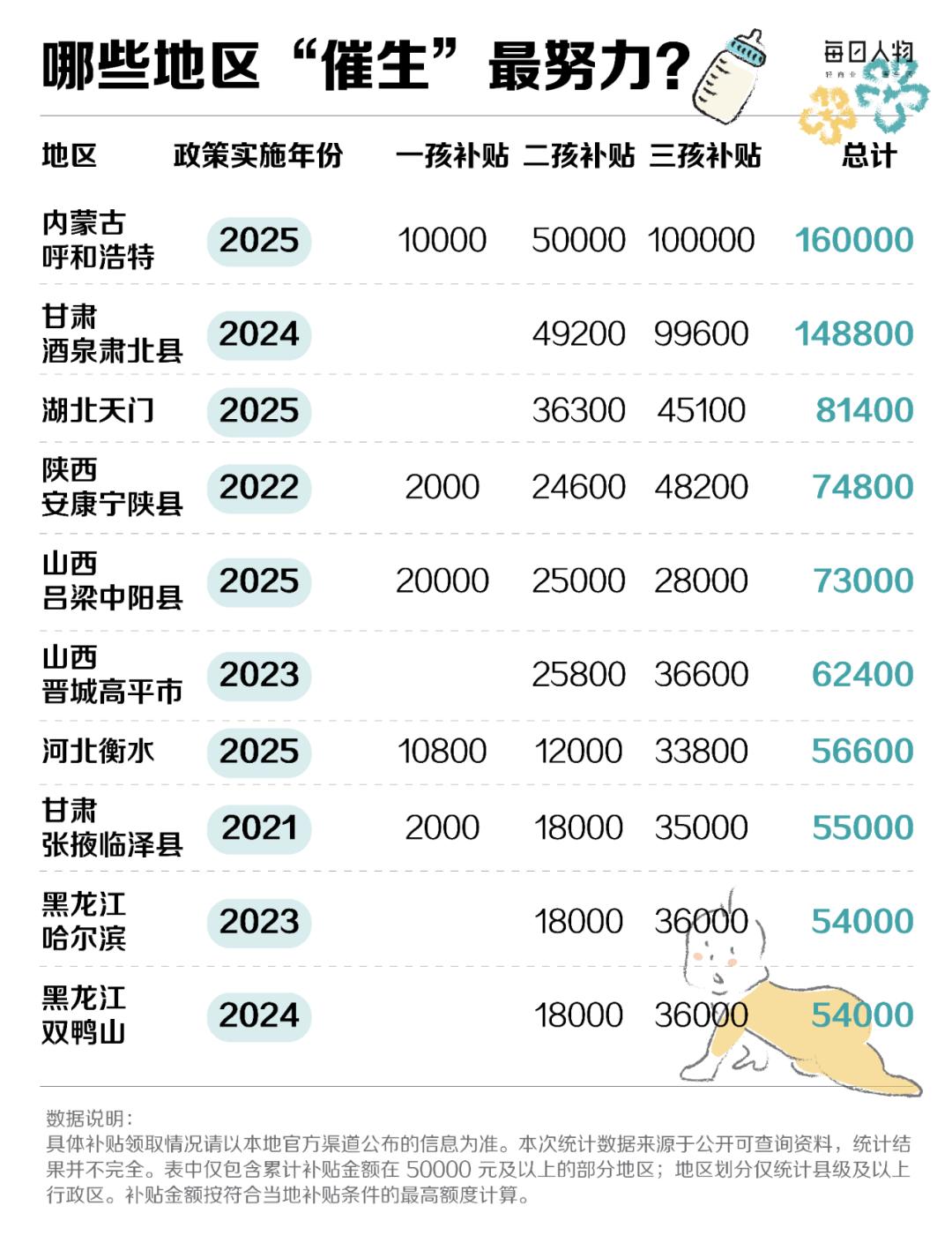 事实上,早在4年前,就已经陆续有城市开始用现金补贴的方式鼓励生育。四川省攀枝花市是首个推出育儿补贴金的城市,针对按政策生育的二孩及以上的家庭,每月每孩补贴500元,直至孩子满3周岁。随后,陕西、山西等省份的部分城市也跟上脚步。每日人物根据官方信息,统计了不同地区的育儿补贴,发现补贴数额较多的地方,大多是二线及以下的城市。在内蒙古呼和浩特和甘肃酒泉肃北县,生育3个小孩,累计到手的直接补贴都超过了10万元。