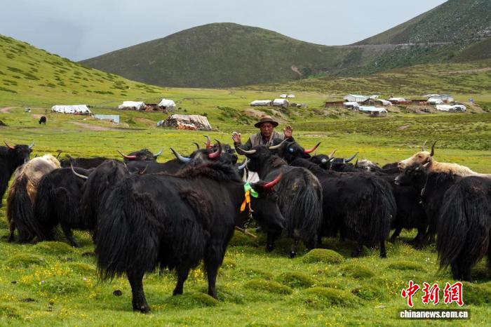 中新网甘孜9月18日电 (单鹏)金秋九月,四川省甘孜藏族自治州乡城县白依乡海拔4000多米的日努贡草场宛如一块巨大的绿色绒毯,生机勃发。膘肥体壮的牦牛在高山草甸上自在漫步、惬意觅食。