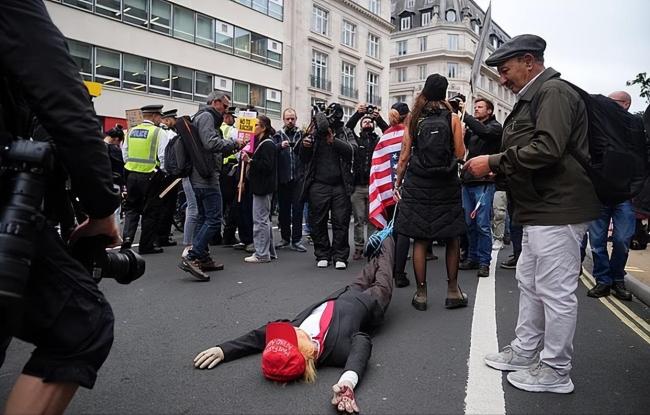 现场重现了2019年特朗普访英时的标志性抗议道具,一个巨型“特朗普宝宝”飞艇再次升空。另有抗议者拖拽特朗普人偶行进,象征对其形象的嘲讽与否定。本次游行吸引了包括大赦国际、巴勒斯坦团结运动、停止战争联盟等左翼团体参与。部分抗议者以戏谑方式表达立场,一名男子身穿以色列总理内塔尼亚胡服装,手持“战争罪犯支持特朗普”标语。