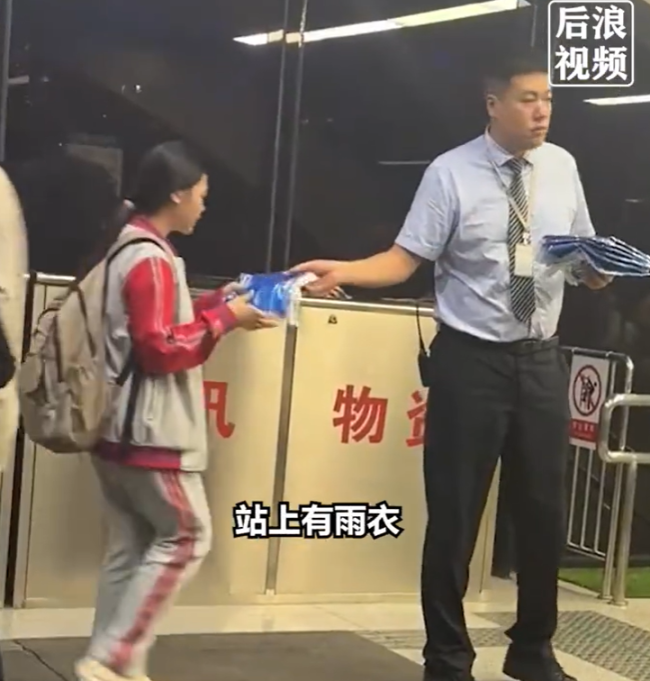 近日,山东济南。下班高峰突降大雨,地铁工作人员站在地铁口为出站乘客免费发雨衣。济南地铁工作人员称:每站都有储备的雨衣,遇到突降雨的情况乘客可自行去找工作人员拿,有的乘客不知道所以有的站工作人员会站在地铁口去发放。