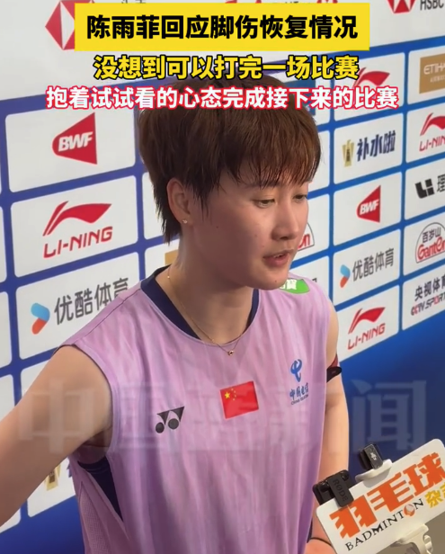 陈雨菲腿上贴着肌贴比赛,最终晋级中国羽毛球大师赛女单16强。赛后采访,陈雨菲表示没想到自己可以完成这场比赛,接下来也会抱着试试看的心态去参赛。目前脚伤还没有完全恢复,大概恢复到了七八成的样子,自己心理上也还是会有些担心和害怕。希望陈雨菲可以健康完赛。