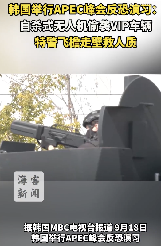韩国APEC峰会反恐演习画面曝光。韩国举行APEC峰会反恐演习:自杀式无人机偷袭VIP车辆特警飞檐走壁救人质。据韩国MBC电视台报道,9月18日,韩国举行APEC峰会反恐演习,演练内容包括应对自杀式无人机袭击和毒气攻击、恐怖分子清剿、人质解救等。10月31日至11月1日,2025年APEC峰会将在韩国庆州举行。
