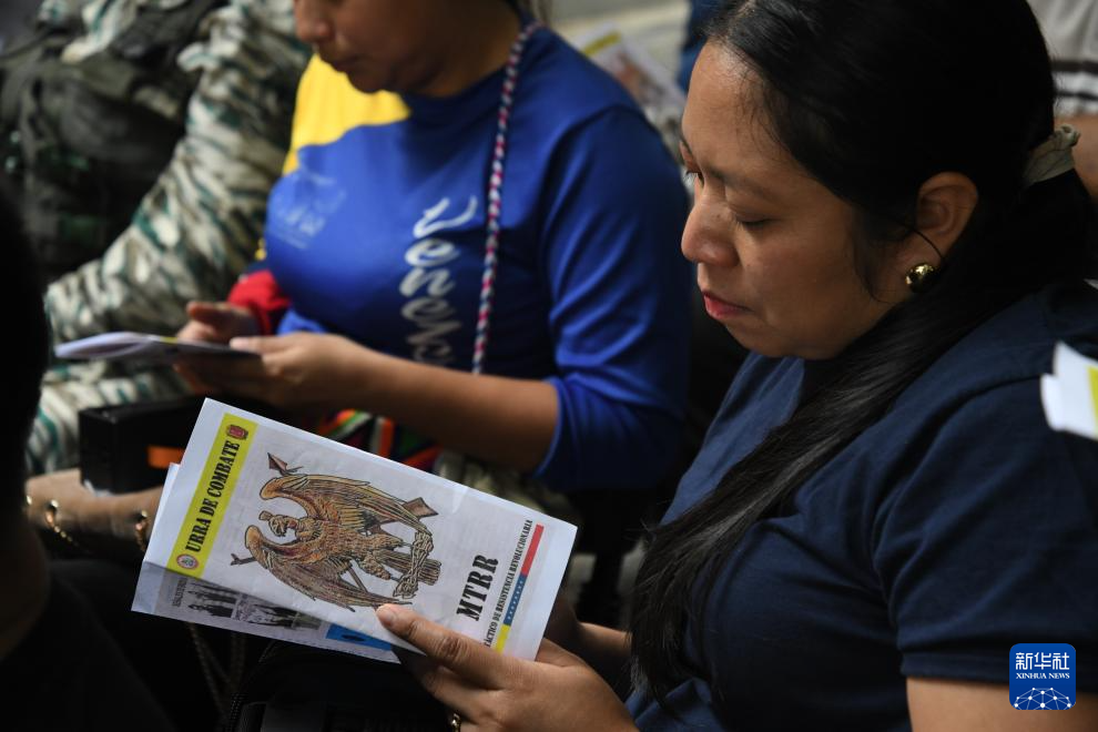 9月20日,在委内瑞拉首都加拉加斯,一名参训者查看《革命抵抗战术方法》手册。新华社发(马科斯·萨尔加多摄)