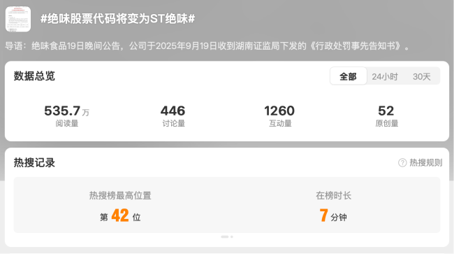 公告发布后,“绝味股票代码将便成为ST绝味”的话题还登上了热搜。