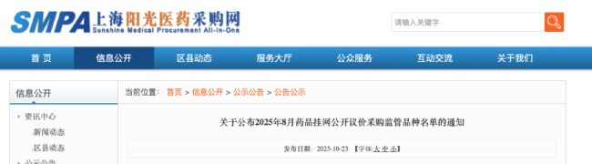 10月23日,上海阳光医药采购网公布2025年8月药品挂网公开议价采购监管品种名单,共有10个药被纳入重点监控(见文末)。