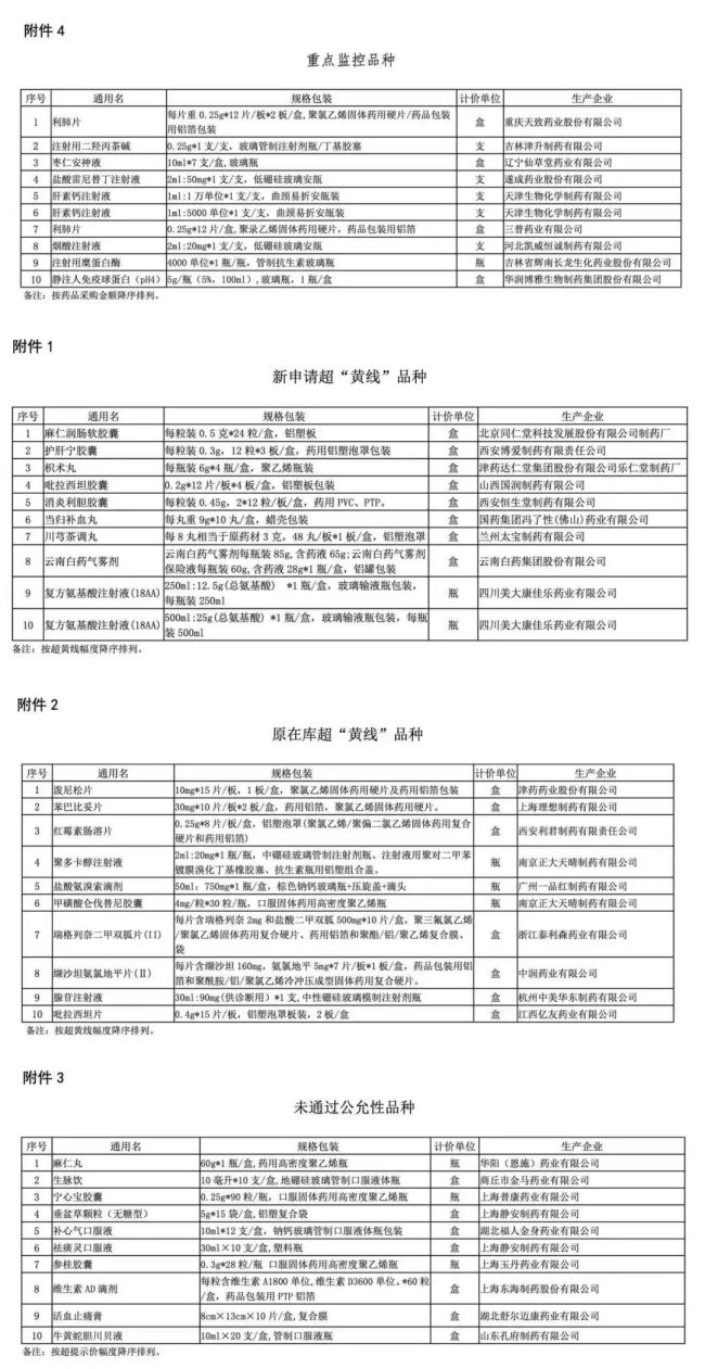 此外,上海阳光医药采购网还发布了“新申请超‘黄线’品种”、“原在库超‘黄线’品种”、“未通过公允性品种”各10个。