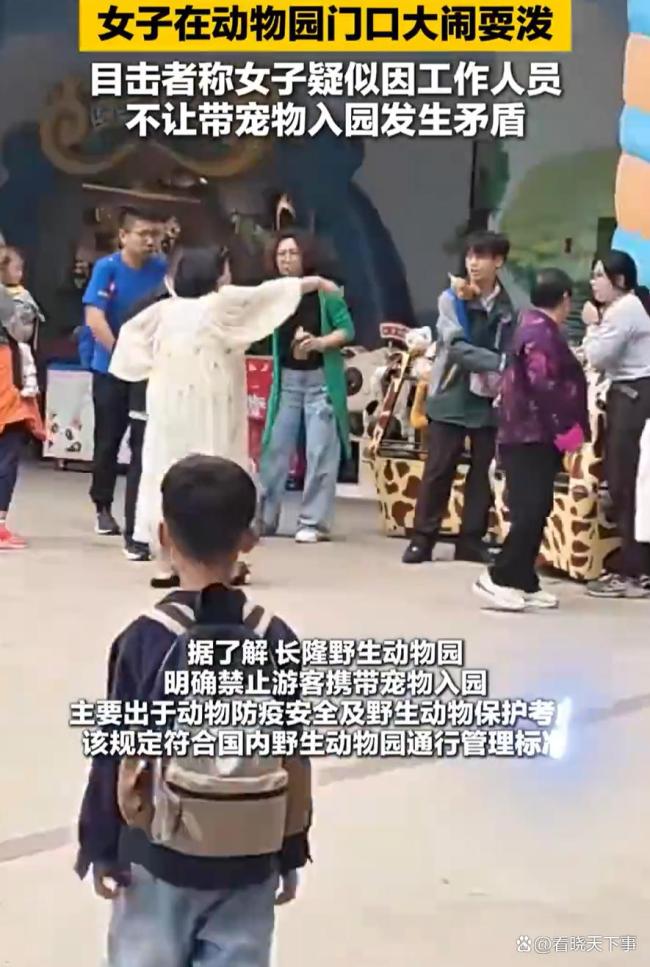 女子带宠物进动物园遭拒疯狂摔东西 规则面前人人平等!广东广州,一名女子带着宠物狗试图进入长隆野生动物园时被工作人员拒绝。根据规定,为了动物防疫安全及野生动物保护考虑,游客不得携带宠物入园。女子对此感到不满,在协商无果后情绪失控,在门口高声吵闹并摔东西。