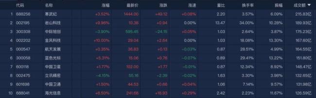 另一方面,大金融、稀土永磁和有色金属等板块领跌。证券方向集体下挫,华林证券跌停。沪深两市成交额为2.8万亿元,较上一个交易日缩量538亿元,成交额已连续4个交易日超过2.5万亿元。个股方面,寒武纪成交额超215亿元居首,岩山科技、中际旭创、金风科技和航天发展成交额靠前。