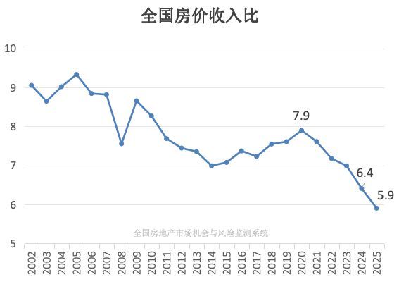 2025年,全国新建商品住宅成交均价为每平米10005元,相比2024年下降了4%,较2023年的高点下跌近9%。同时,全国城镇地区人均可支配收入达到56502元,同比增长4.3%。经过计算,2025年全国的房价收入比为5.9倍,即一个三口之家需用5.9年的收入才能购买全国平均单价一万元、一百平米的房子。2024年的房价收入比是6.4倍,而2020年为7.9倍。2012年之前,全国房价收入比基本保持在8倍以上。进入本世纪以来,年度房价收入比的平均值为7.9倍,因此2025年的5.9倍已经明显低于过去20多年的平均水平,并且自2021年以来,房价收入比已连续五年下降。
