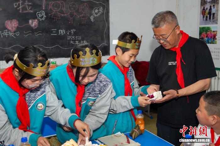 姚建(黑)和学生们一起过生日。陈艳秋 摄
