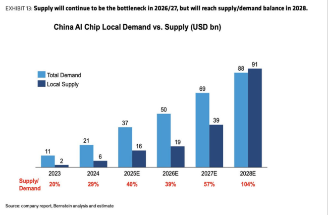 按照该机构的预测,虽然最近两年国产AI芯片的供需比还不高,但到2028年,国产AI芯片将供过于求,供需比预计达到104%。